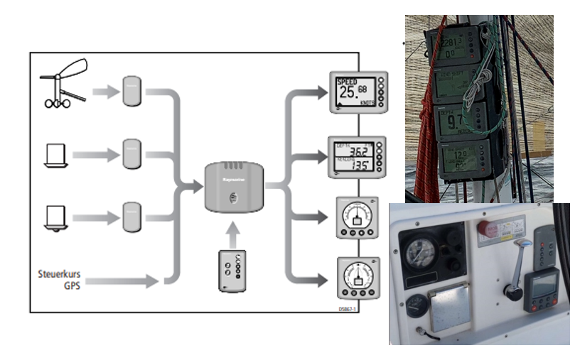 Alle Komponenten kommunizieren im NMEA0183 Netzwerk. Die Masteinheit kann vom Ruder aus fernbedient werden. Es wurde von mir eine Fernbedienung S100 für den Autopiloten nachgerüstet, um bei Einhandmanövern auch vom Vordeck aus Kurskorrekturen vornehmen zu können.
