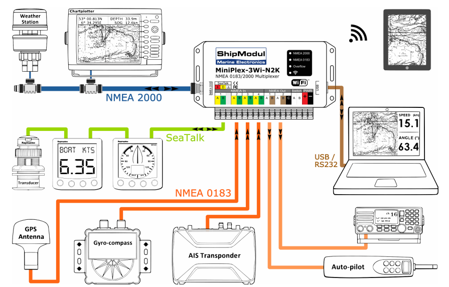 Auch heute gibt es das Originalzubehör noch zu kaufen. Es wird aber weniger und die Preise haben es in sich. Daher habe ich einen Multiplexer in das Netzwerk integriert. Damit sind die Botschaften aus dem NMEA0183 Netzwerk nun auch per WLAN abrufbar. Das habe ich gemacht, um z.B. auf dem IPad mit Navionics ebenfalls die Tiefenangaben und AIS-Meldungen darstellen zu können. Multiplexer gibt es in vielen Ausführungen. Ich habe mich für ein Shipmodul Miniplex3 Wifi entschieden. Es kann nicht nur NMEA0183 Netzwerke verbinden, sondern kennt auch Seatalk von Raymarine.