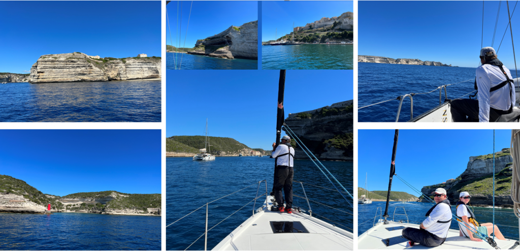 Weiter ging es dann Richtung Bonifacio. Bei Windstille konnten wir in aller Ruhe durch die Straße von Bonifacio. Berüchtigt für Wind und Welle. Nicht bei uns. Sonne und platte See. Ideal, um unter Motor die Hafeneinfahrt und Steilküste zu genießen. Auch für unseren Skipper, der sich entspannt die Sightseeingtour gönnte.