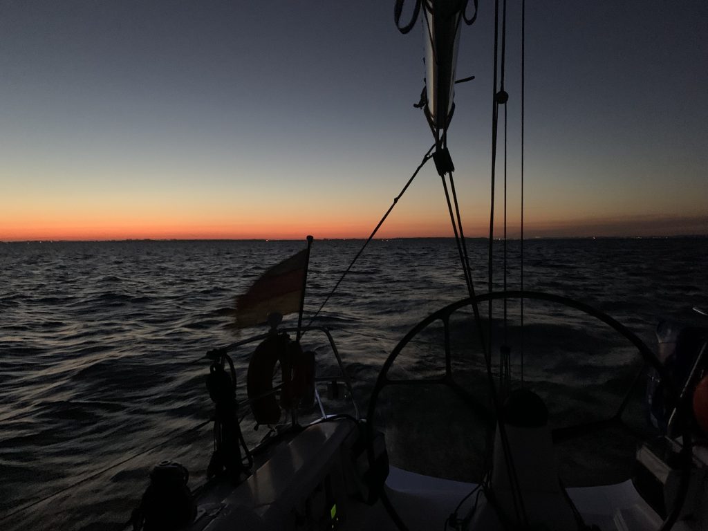 Der Törnplan passt. Zwar weht es bis zur Bukspitze eher mit 24 kn. Durch die Landabdeckung steht aber kaum Welle. Das ändert sich danach, da die Welle aus der Lübecker Bucht kommt. Daher muss ich erst einmal auf Grömitz zuhalten. Das segle ich, bis gegen 16:30 der Wind nachlässt und die Sonne untergeht. Jetzt werden die Segel geborgen. Motoren ist angesagt. Es wird doch deutlich kälter. Der Sonnenuntergang ist aber herrlich. Die Welle wird weniger.