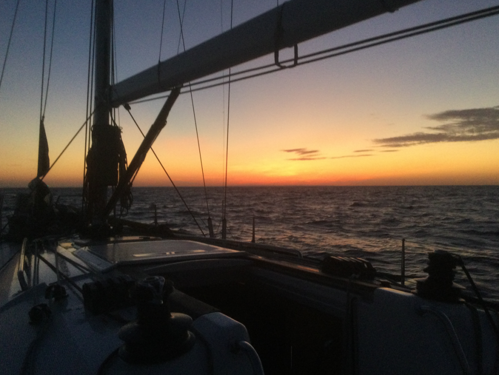 Um 4:30 laufe ich aus. Es ist noch stock duster. Aber Windstill. Ideal, um die ersten Seemeilen unter Motor zu machen. Die Sonne geht hinter mir auf. Der Horizont leuchtet rot.