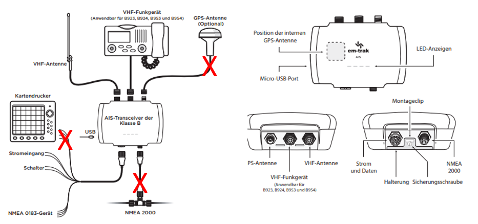 Auf der Bavaria 38Match ist bisher ein NMEA0183 Netzwerk von Raymarine installiert. Auf die Komponenten gehe ich in einem anderen Artikel Bordnetz Raymarine ST60/NMEA0183 ein. Als AIS Empfänger war ein Wheatherdock EasyAIS mit Splitter verbaut. Es erfolgt ein Update auf einen Sender/Empfänger der Firma Em-Trak B953.