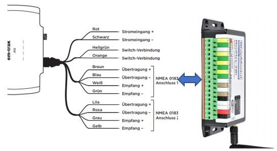 Das Em-Trak bietet 2 NMEA0183 Anschlüsse. Damit die Verbindung keine Störungen verursacht, habe ich das Datenkabel gelötet. Im Netzwerk ist der Em-Trak B953 an meinen Multiplexer NMEA0183 (Multiplexer mit USB und WiFi MiniPlex-3W) angeschlossen. Über diesen bekommt mein IPAD mit der Navionics-Software über WLAN die AIS-Meldungen.