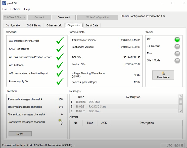 Nachdem alle Verbindungen installiert waren, erfolgte der Testbetrieb. Hier musste ich feststellen, dass die alte Antenne nicht ausreichend war, um auch zu senden. Das stellte ich über die Konfigurationssoftware ProAIS2 fest. Im Handbuch des Gerätes ist es nicht beschrieben, daher möchte ich hier beschreiben.